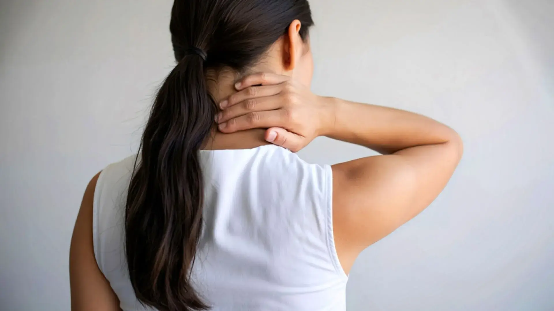 One shoulder appearing slightly higher than the other due to muscle tension.
